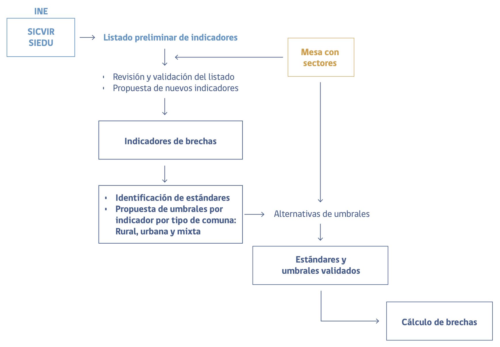 Las instituciones responsables de cada indicador definieron valores de comparación para determinar si las comunas cuentan o no con niveles mínimos aceptables de cada infraestructura o servicio medido. Si una comuna está por debajo del valor de comparación definido, se considera que la comuna está en una situación de brecha, indicando una necesidad de atención, planificación y/o inversión.
