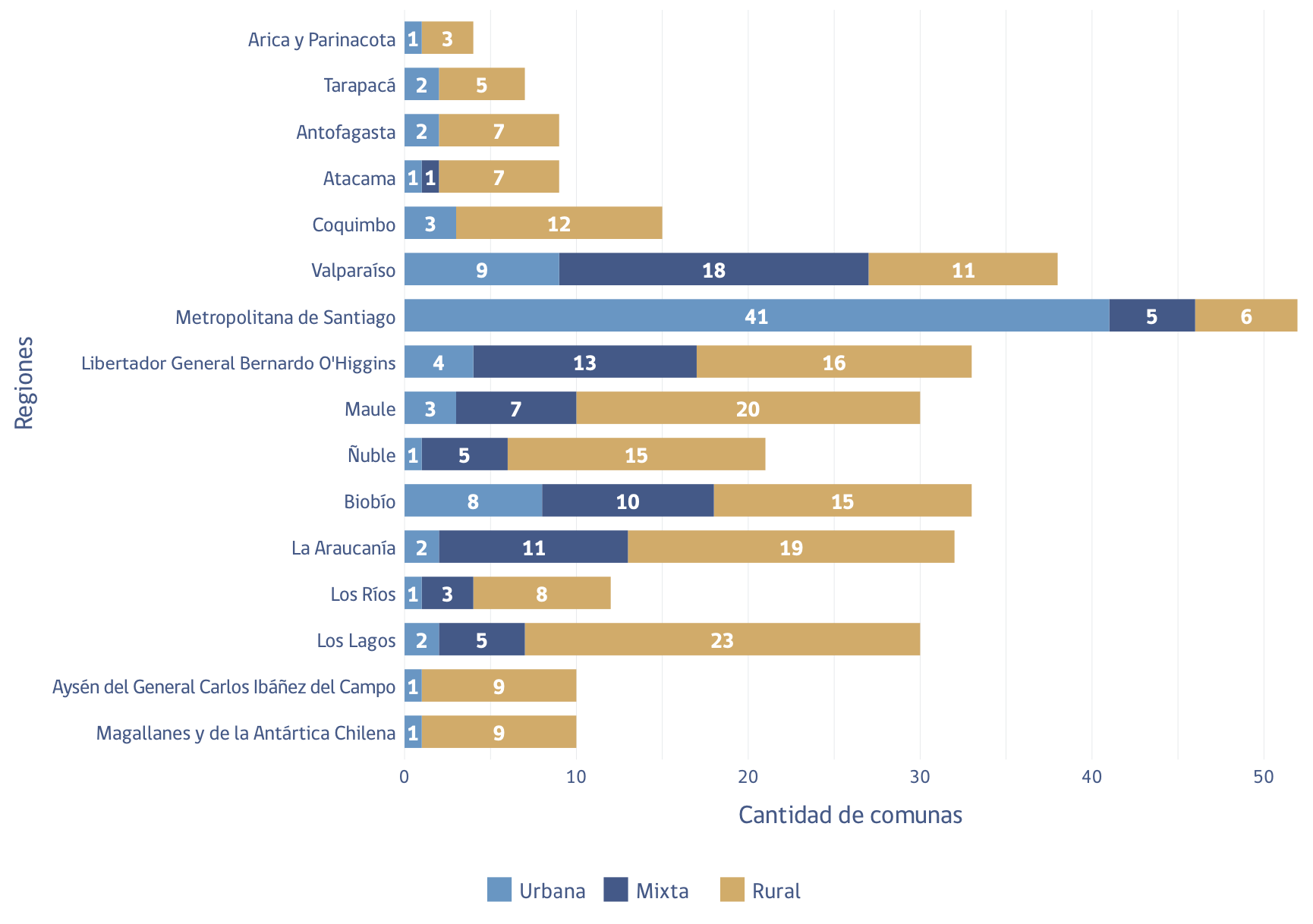 En consideración de la alta heterogeneidad territorial de nuestro país, relacionada con la diversidad de condiciones sociodemográficas, se ocupó como criterio transversal la clasificación de comunas urbanas, rurales y mixtas propuestas por la PNDR, definidas según los siguientes criterios: