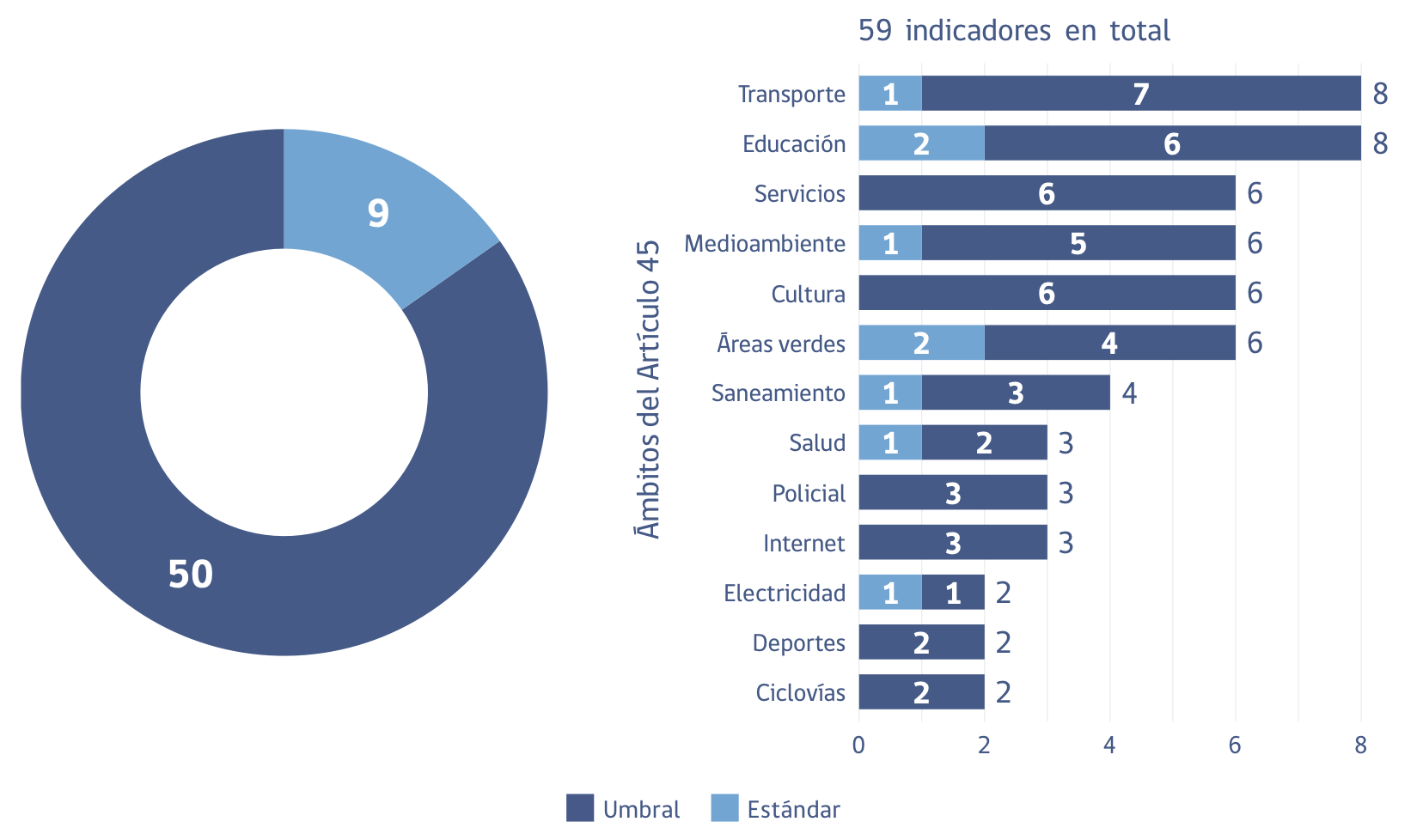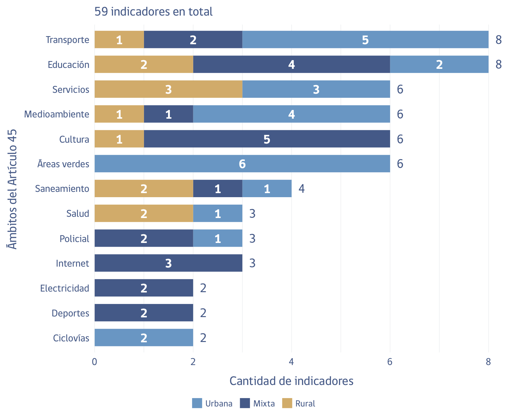 Mediante un trabajo intersectorial, se reunieron 59 indicadores que miden infraestructura y servicios a nivel comunal, clasificados en 13 ámbitos. Cada indicador aplica a clasificaciones específicas de comunas: urbanas, mixtas y/o rurales, por lo que no todos los indicadores aplican a las 346 comunas del país.